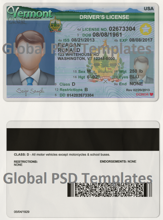 This Vermont Driver License template is a High quality template. You can change the photo, number, name, address, birth date, expiry date, etc. (Fully editable, all fonts included)